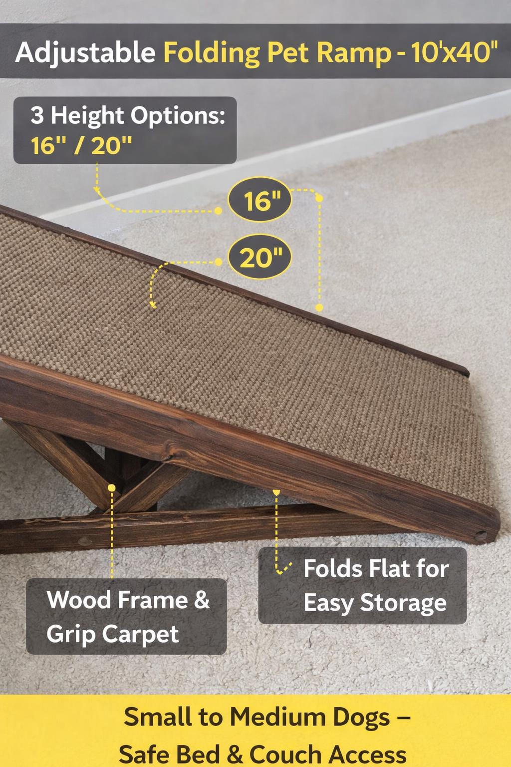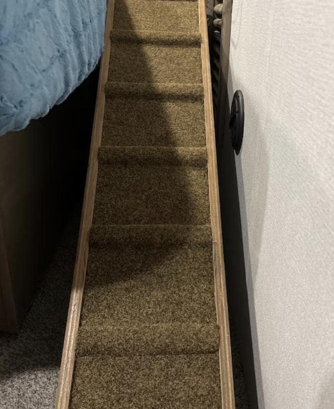 This handmade wooden pet ramp is the perfect solution for aging or arthritic pets who need a little help reaching their favorite spots—whether it’s the bed, couch, RV, or any elevated area.