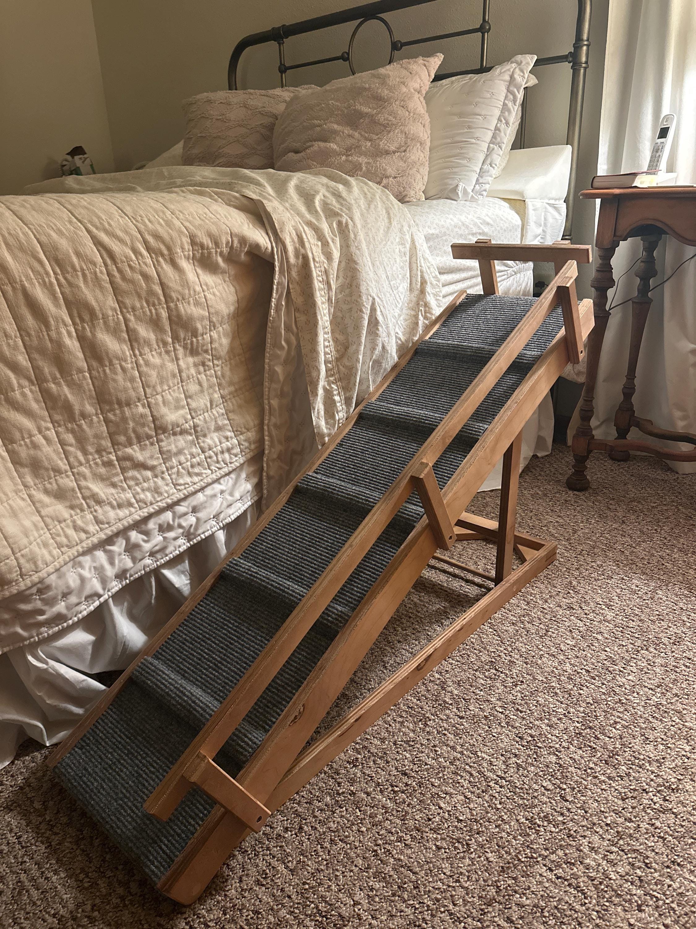 My handcrafted pet ramps are the perfect solution for helping aging, arthritic, or small pets get up onto beds, couches, RVs, or other hard-to-reach spots with ease. Built from sanded pine, these ramps are lightweight, sturdy, and easy to move and handle.