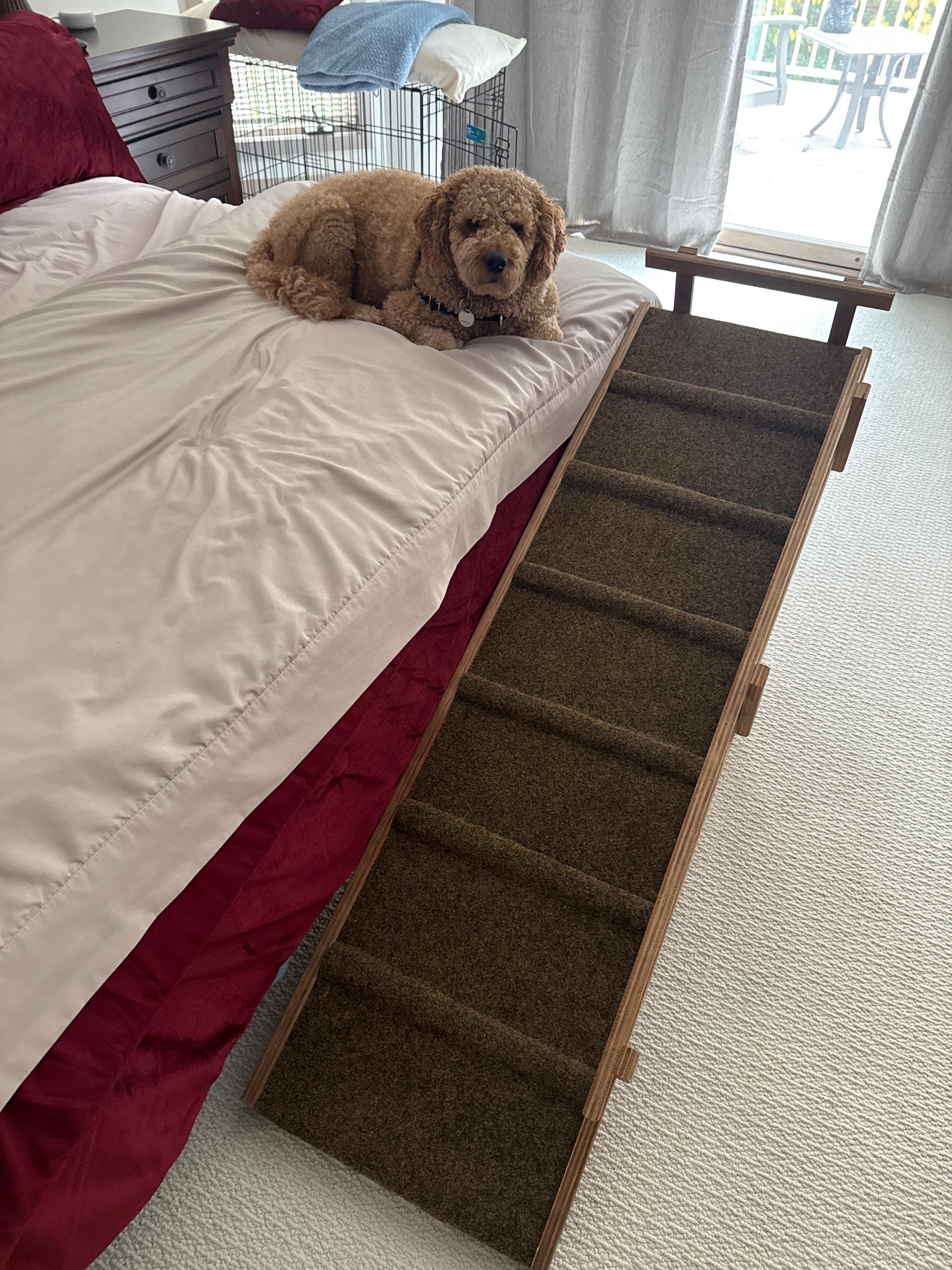 Purchased this because my 4 year old goldendoodle required ACL surgery on rear leg. Dr. recommended a ramp over stairs for rehab and beyond. I have no problem with the quality of the ramp and exceptional communication with Kevin at OzarkNaturalDesigns. Where I am having a problem is with the carpet attached to the ramp. My poochās paws slip on the material going up making him afraid to use it. Thinking of removing the carpet? Otherwise, the ramp is a beautiful piece of furniture even if it will require training to get him used to using it. That is the only reason not giving a 5th star. I would still recommend this product for anyone in this situation.