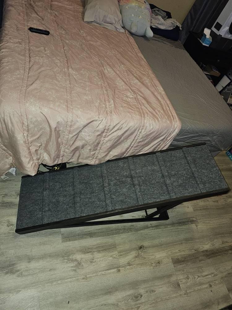 Great quality, very easy to set up and take down. My dog is older, has arthritis, and just had surgery today. This has been a lifesaver for us and her both. She weighs almost 70 lbs, & I am not able to lift her up on my own. She loves to sleep next to me each night but it had become almost impossible for her to do anymore bc she wasn't able to jump up there by hersel. This worked perfectly to safety allow her to get back on the bed again, all on her own. Thank you for the great ramp & great service!